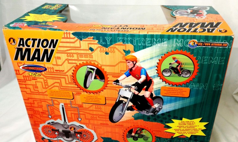 MOUNTAIN BIKE R/C de ACTION MAN. Pilas no incluidas, pedalea de verdad y velocidad controlada a distancia.Juguete original de Hasbro ref.10216 del año 2001. (producto nuevo nunca vendido, procede de nuestra tienda, la caja presenta roces y defectos propios del paso del tiempo y de la manipulación de almacén)
