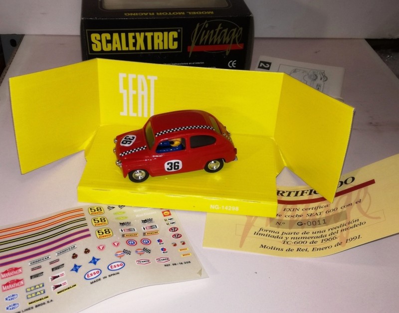 Coche Scalextric 1/32 con re. 8333 fabricado por EXIN en 1991. Réplica del primer coche de Scalextric completamente diseñado y fabricado en España por la propia EXIN en 1966. Edición especial "Vintage" limitada a 10.000 unidades (unidad a la venta nº G-0011). Primer coche de la serie VINTAGE y primera reedición del Seat 600. Numero de serie gravado en el chasis.Artículo nuevo, nunca vendido, procedente de nuestra tienda.