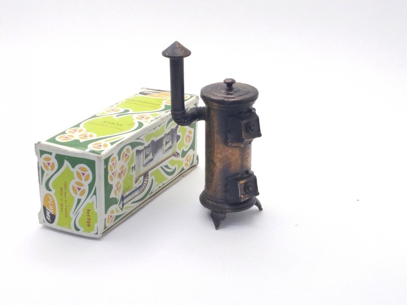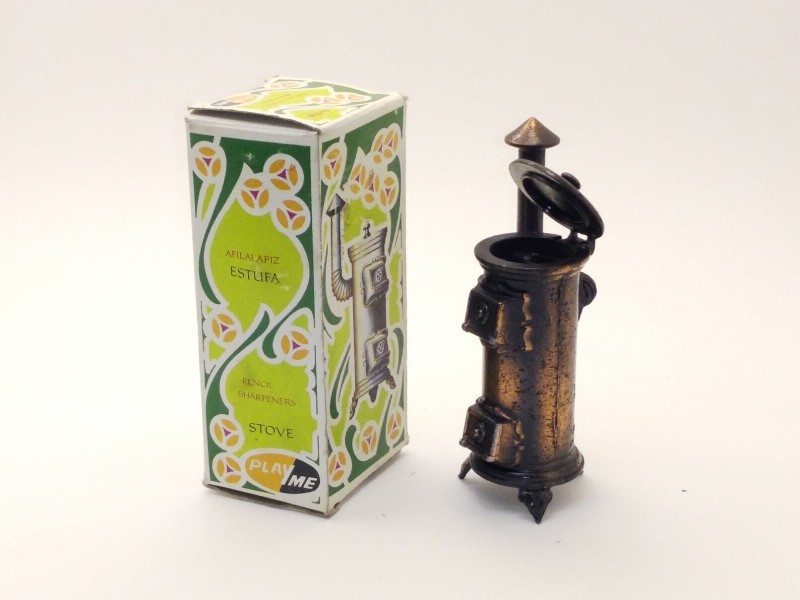 Afilalapiz o sacapuntas de metal de PlayMe con forma de estufa antigua. Fabricado en España. (producto nuevo nunca vendido, procede de nuestra tienda, la caja presenta roces y defectos propios del paso del tiempo y de la manipulación de almacén)