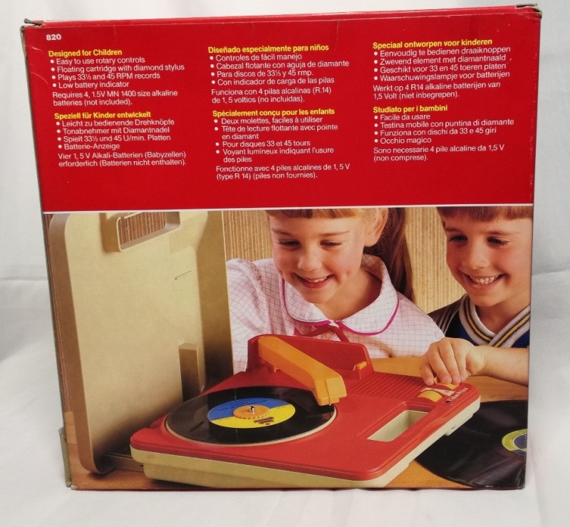 TOCADISCOS PORTATIL año 1973 ref.820 FISHER PRICE. Funciona con discos de 33 y 45 RPM y requiere 4 pilas R14. (producto nuevo nunca vendido, procede de nuestra tienda, la caja presenta defectos y roces producto del paso del tiempo y de la manipulación en el almacen) Ver fotos.